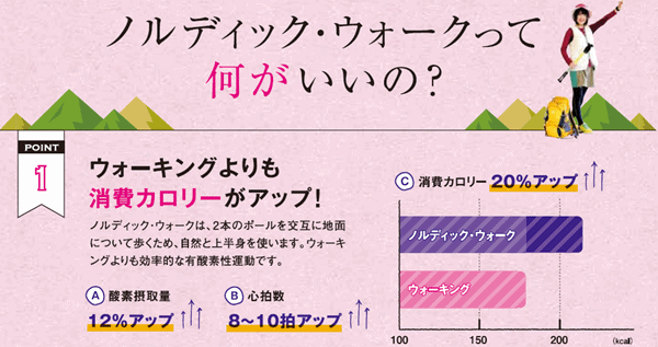 ≪気になる効果≫ ・正しく行えば全身の筋肉の約90%もを使用! ・通常のウォーキングだと、消費カロリー1時間280カロリー程度のところ、ノルディックウォーキングだと400カロリーの消費が可能になるという立派な有酸素運動です。