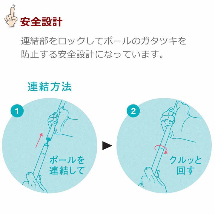 ■安全設計 連結部をロックしてポールのガタツキを防止する安全設計になっています。